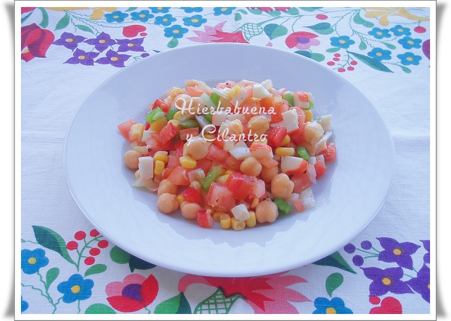Picamos la cebolla, los tomates y los pimientos en cuadraditos.Lo ponemos todo en un bol y añadimos los palitos de cangrejo también partidos en cuadraditos.